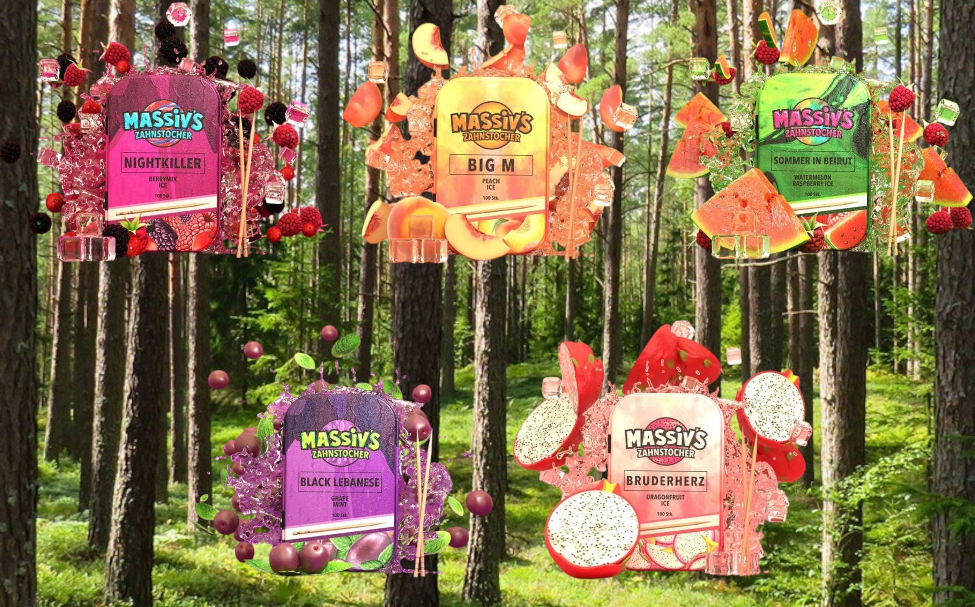 5 x Massiv's Zahnstocher mit Geschmack Peach Ice, Berrymix Ice, Grape Mint, Dragonfruit Ice, Watermelon Raspberry Ice